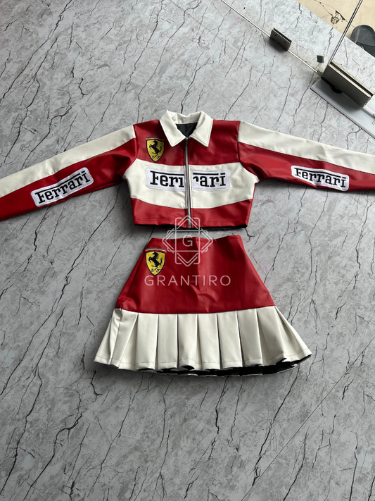 Red & White Leather Crop Jacket & Pleated Skirt Co-ord Set | Grantiro® Luxe Edition